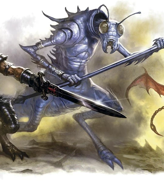 Gelugons are among the most alien of the devils. They appear as huge lanky insectoids, usually 10-12 feet tall, with antennae, pincers, and inscrutable compound eyes like those of a fly. They are highly educated and fiercely intelligent; Abn-Azer describes the least of them as being on par with the greatest human scholars and military geniuses in history.